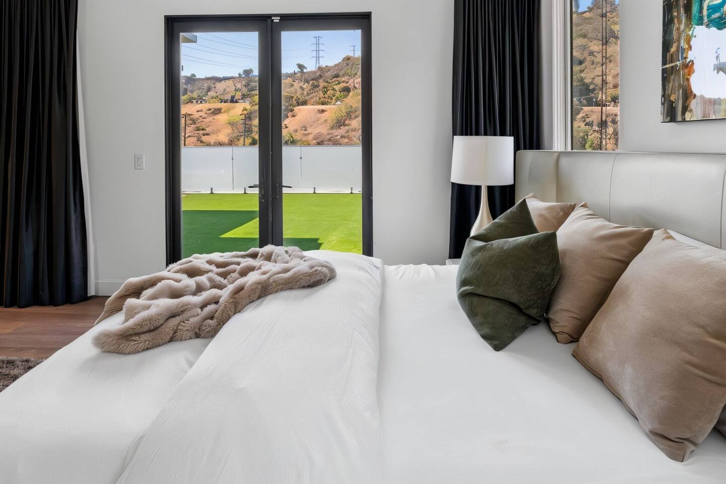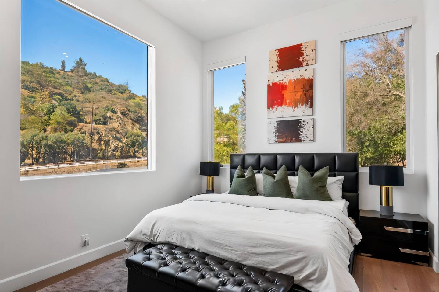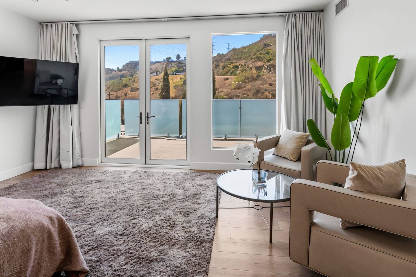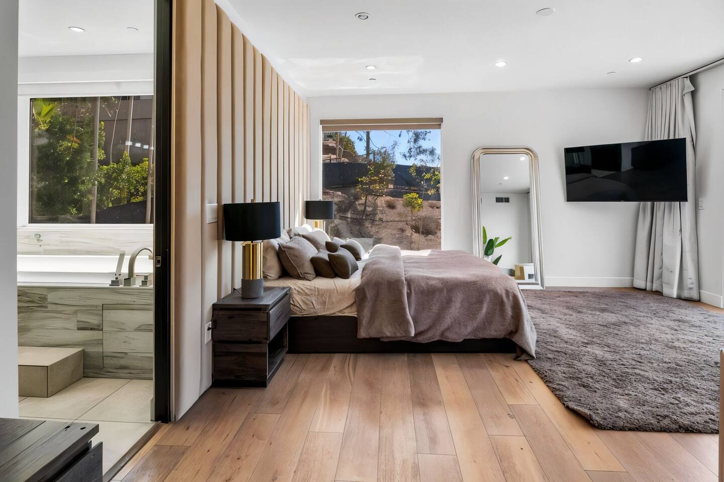 Welcome to Hill House, a fully furnished luxury mansion in the iconic Hollywood Hills, just minutes from West Hollywood, the Sunset Strip, Beverly Hills, and Runyon Canyon. This private 4,000 sq ft hillside estate is designed for extended stays and executive living in Los Angeles. With panoramic mountain views, a resort-style pool, and seamless indoor-outdoor flow, the home offers a refined environment ideal for relocation, entertainment industry housing, corporate stays, or families seeking a private monthly rental in an exclusive neighborhood. The Space The home features five total bedrooms thoughtfully arranged for comfort and flexibility: • Two primary king suites with ensuite bathrooms and hotel-quality linens • One additional ensuite queen bedroom • One queen guest bedroom • One bonus room staged as a study, lounge, or optional twin bedroom — perfect for remote work, children, or extended guest use The main living area is filled with natural light and opens to a private balcony with hillside views. A fully equipped chef’s kitchen and formal dining space make long-term living effortless and comfortable. Step outside to your private pool and sun deck, complete with a natural rock waterfall feature and surrounding mountain views — a peaceful retreat above the city. Amenities • High-speed Wi-Fi • Smart TVs in primary bedrooms and living areas • Central air conditioning and heating • Washer and dryer • Driveway parking for two vehicles • Free street parking (no permit required) • Garage used for storage (no vehicle parking) Stay Details This is a 31+ night minimum stay property in compliance with Los Angeles regulations. The home is located in a quiet residential neighborhood and is best suited for responsible guests seeking privacy and comfort for an extended stay. • No parties or events • Quiet hours begin at 9 PM • Light guest reset requested at checkout • Professionally cleaned between each reservation If you’re searching for a Hollywood Hills furnished rental, luxury monthly stay in Los Angeles, or an executive home near the Sunset Strip, Hill House offers space, privacy, and elevated living in one of LA’s most desirable hillside communities.