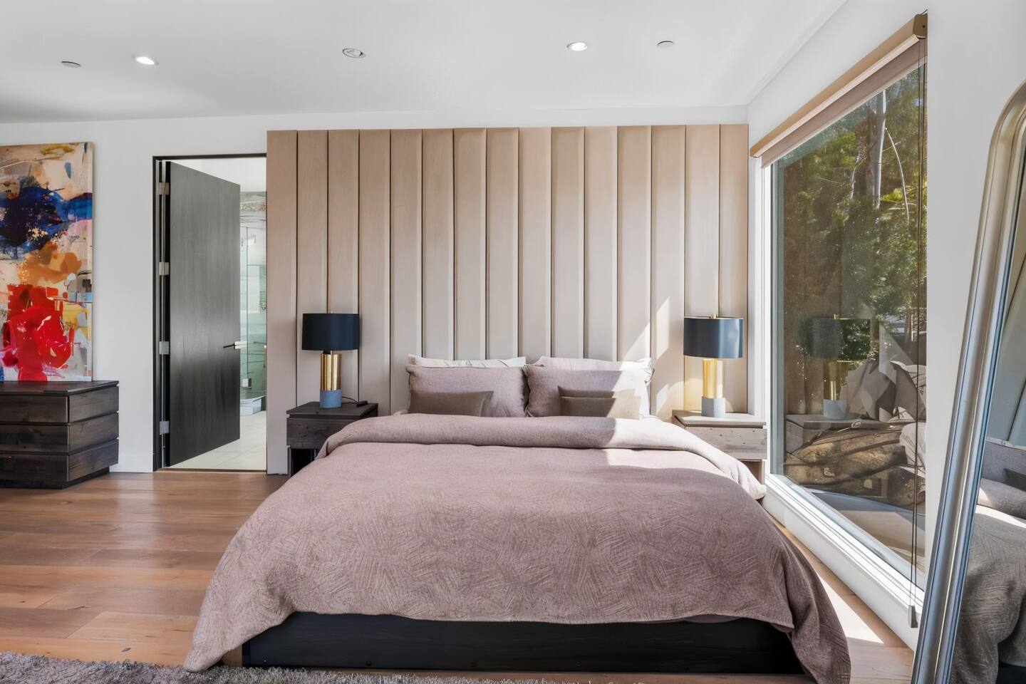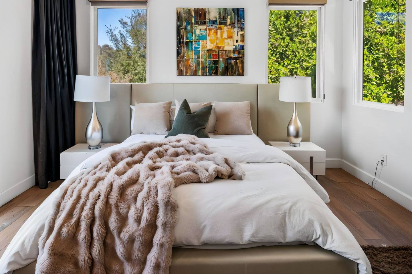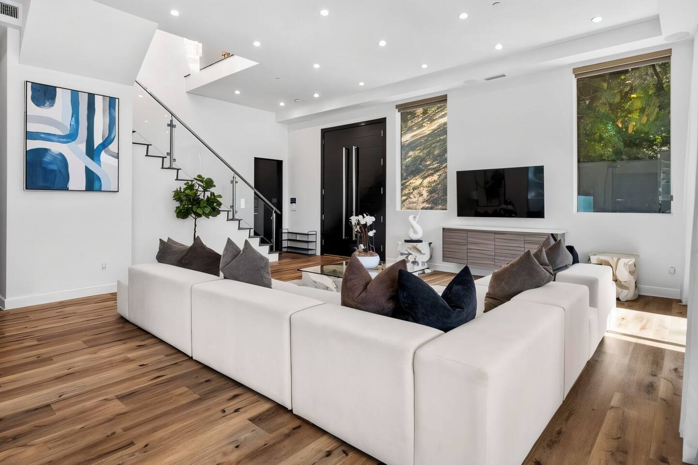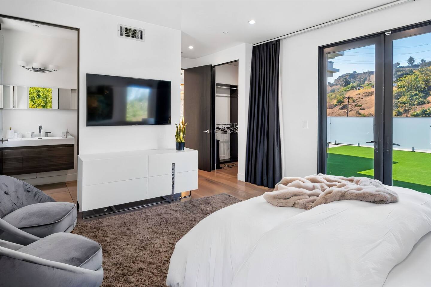 Welcome to Hill House, a fully furnished luxury mansion in the iconic Hollywood Hills, just minutes from West Hollywood, the Sunset Strip, Beverly Hills, and Runyon Canyon. This private 4,000 sq ft hillside estate is designed for extended stays and executive living in Los Angeles. With panoramic mountain views, a resort-style pool, and seamless indoor-outdoor flow, the home offers a refined environment ideal for relocation, entertainment industry housing, corporate stays, or families seeking a private monthly rental in an exclusive neighborhood. The Space The home features five total bedrooms thoughtfully arranged for comfort and flexibility: • Two primary king suites with ensuite bathrooms and hotel-quality linens • One additional ensuite queen bedroom • One queen guest bedroom • One bonus room staged as a study, lounge, or optional twin bedroom — perfect for remote work, children, or extended guest use The main living area is filled with natural light and opens to a private balcony with hillside views. A fully equipped chef’s kitchen and formal dining space make long-term living effortless and comfortable. Step outside to your private pool and sun deck, complete with a natural rock waterfall feature and surrounding mountain views — a peaceful retreat above the city. Amenities • High-speed Wi-Fi • Smart TVs in primary bedrooms and living areas • Central air conditioning and heating • Washer and dryer • Driveway parking for two vehicles • Free street parking (no permit required) • Garage used for storage (no vehicle parking) Stay Details This is a 31+ night minimum stay property in compliance with Los Angeles regulations. The home is located in a quiet residential neighborhood and is best suited for responsible guests seeking privacy and comfort for an extended stay. • No parties or events • Quiet hours begin at 9 PM • Light guest reset requested at checkout • Professionally cleaned between each reservation If you’re searching for a Hollywood Hills furnished rental, luxury monthly stay in Los Angeles, or an executive home near the Sunset Strip, Hill House offers space, privacy, and elevated living in one of LA’s most desirable hillside communities.